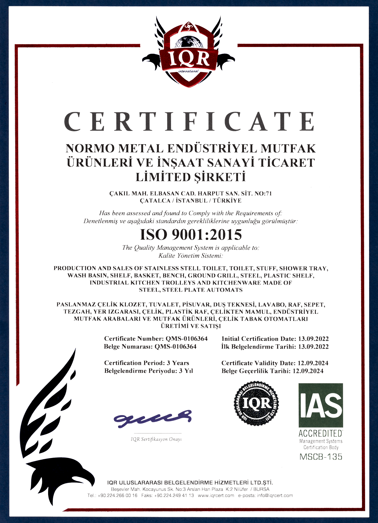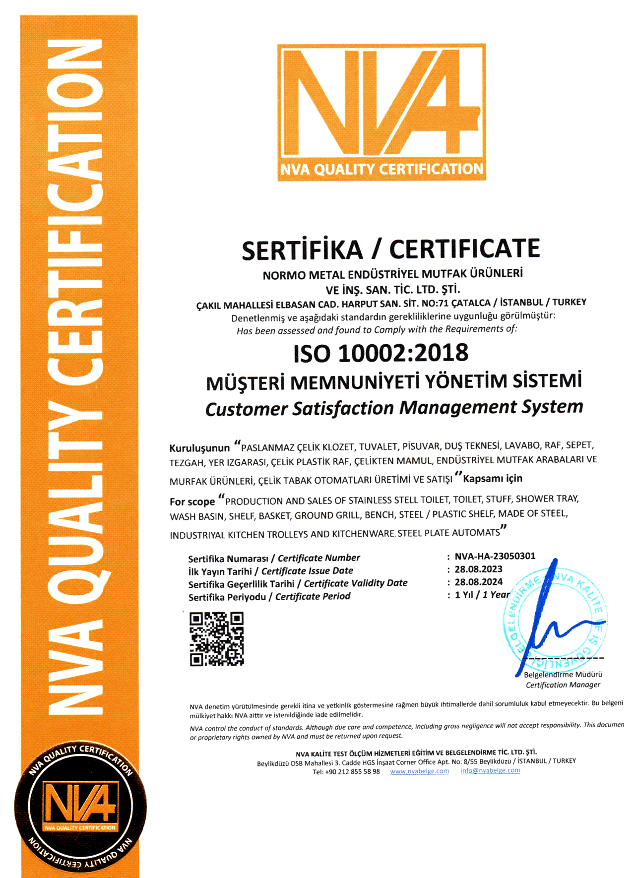 Normo Metal, sektöründe lider konumunu sürdürmek için kalite ve uygunluk standartlarına titizlikle uyan bir şirkettir. Ürün portföyümüzde yer alan her metal ürün, uluslararası standartlara uygun olarak üretilmekte ve müşterilerimize en yüksek kalitede ürün sunma taahhüdümüzü yansıtmaktadır.